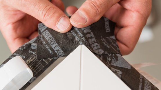 Pour permettre ultérieurement un collage facile et fiable du ruban dans l’embrasure de la fenêtre, réalisez les plis dans les coins comme illustré ici et collez CONTEGA SOLIDO IQ-D sur le pourtour.