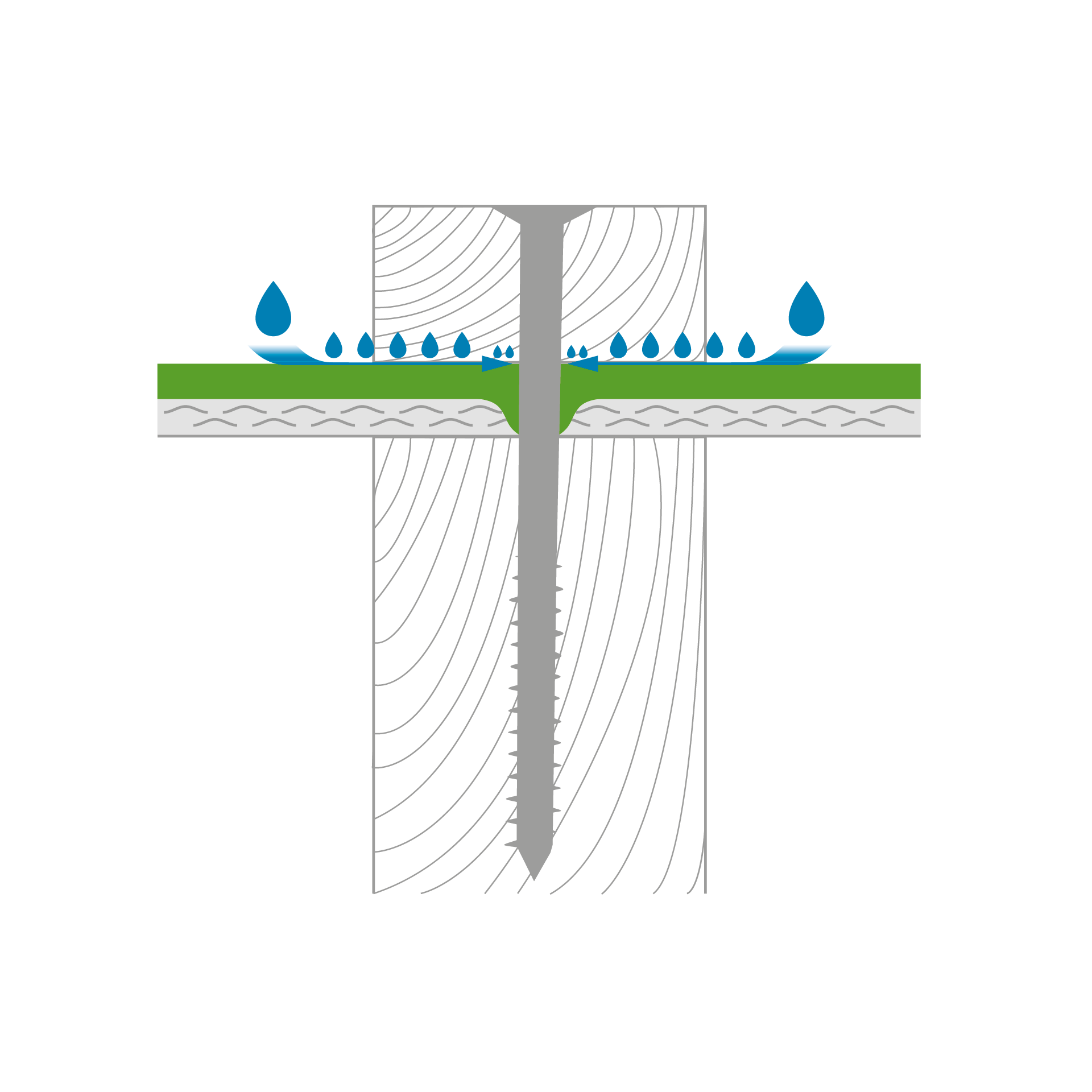 La compression du lé contre une sous-construction résistante à la pression (≥100 kPa) est déterminante. Pour ce faire, le revêtement élastique en TPU est durablement étanche à l'eau au niveau des moyens de fixation (clous ou vis / voir illustration à gauche).