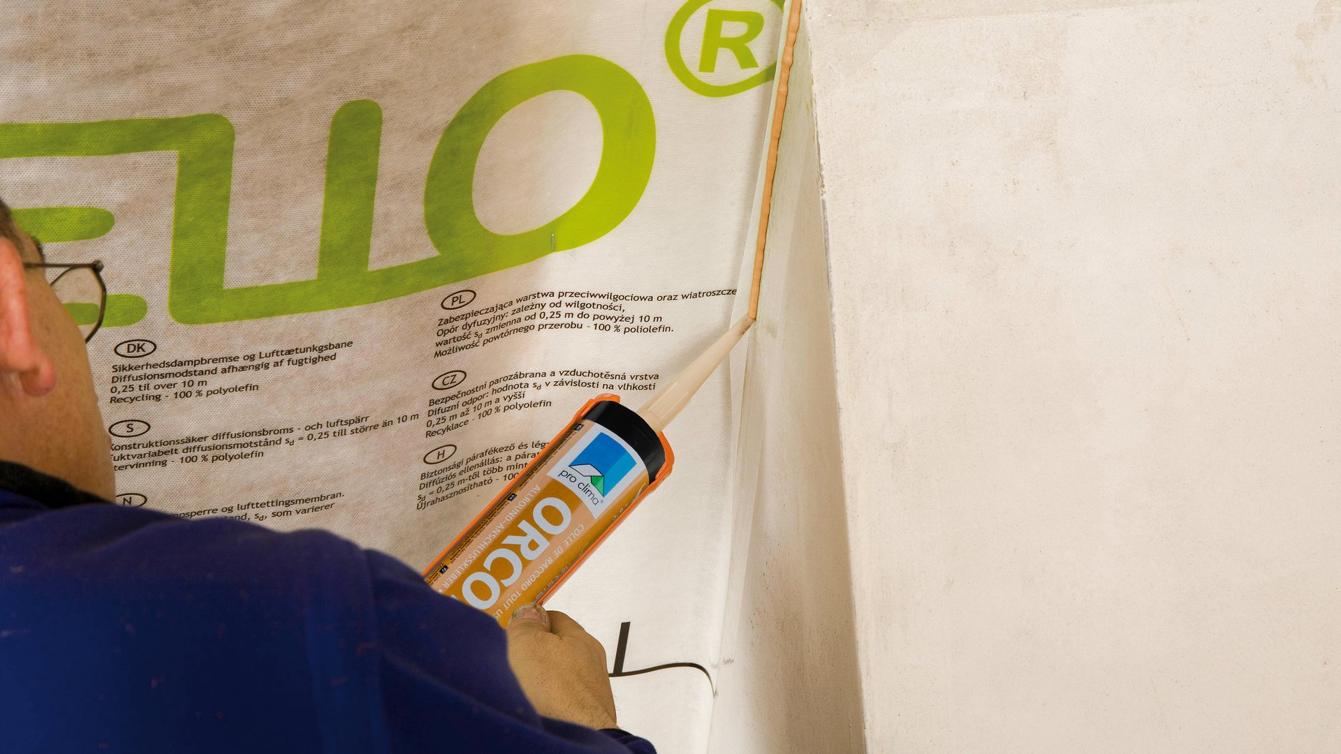 Coller le ruban de raccord d’enduit CONTEGA PV sur la membrane INTELLO à l’aide de ruban adhésif.